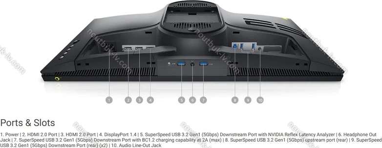 - 1x DisplayPort 1.4, 2x HDMI 2.0, 1x USB-B 3.0 (исходящий, 5Gb/s), 4x USB-A 3.0 (входящий, 5Gb/s), 2x разъем 3.5 мм выход на наушники, 1x AC-In C14 (подключение к электросети)